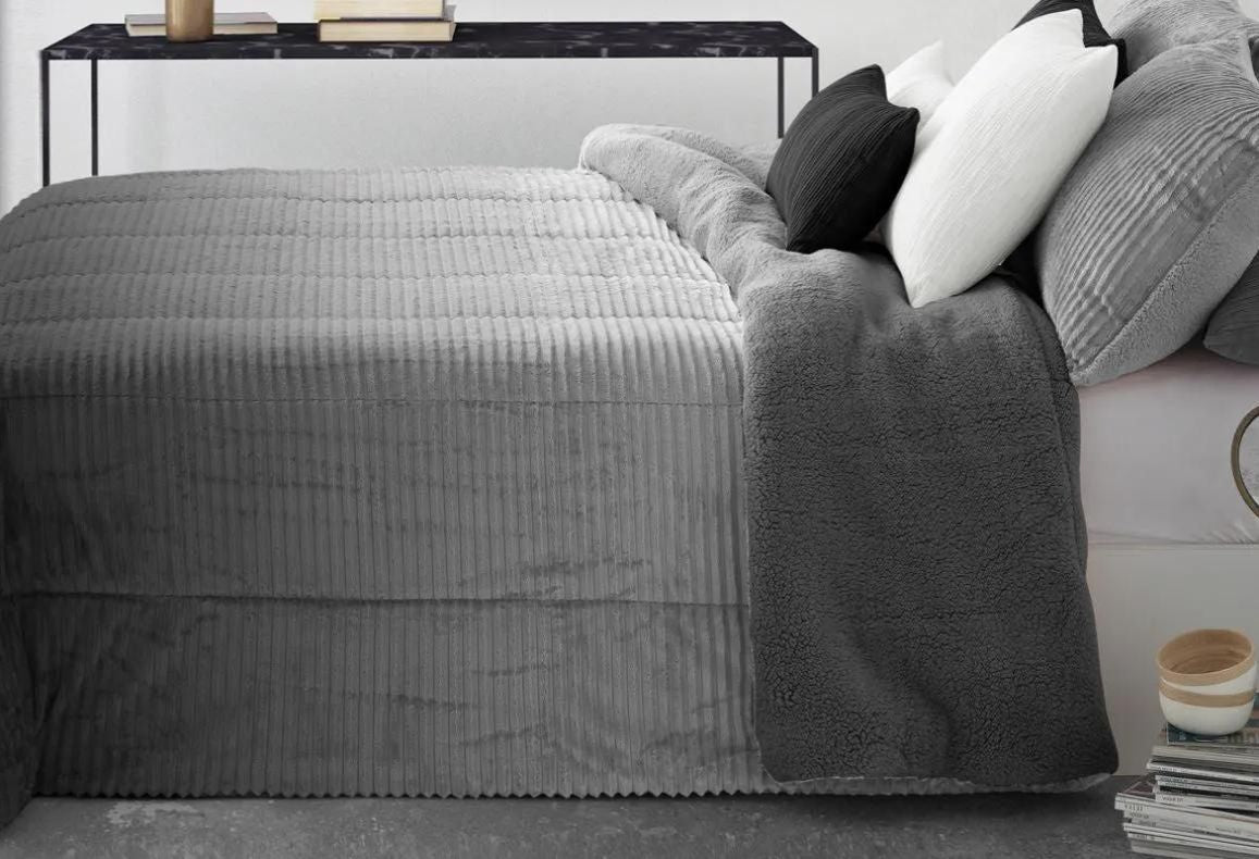 Dessin DÉGRADÉ (flou) avec relief jacquard sur une face et sherpa teinté au verso.